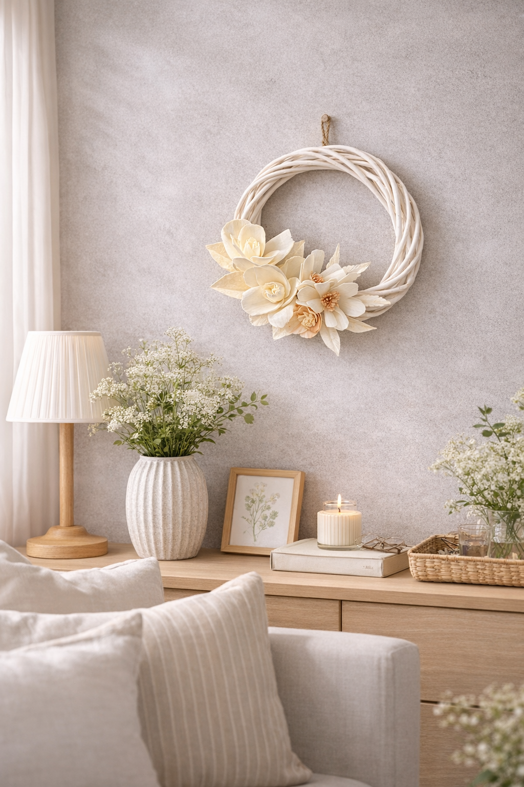 タイの植物「ソラ」のシートから作るソラフラワー。自然な風合いが魅力です。ソラフラワーと合わせる葉は和紙などを使います。初夏の爽やかなリースを作りましょう。