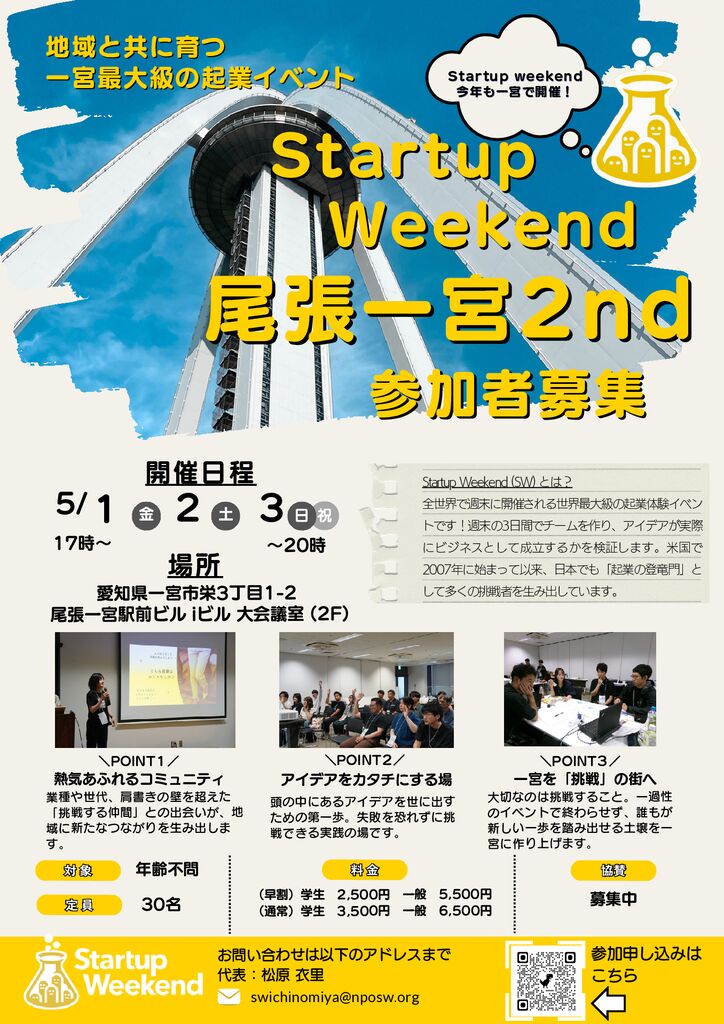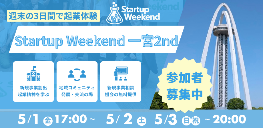 全世界で「起業家を生み出す場」として展開するStartup Weekendが一宮市にて開催!新規事業を立ち上げたい方!起業体験を積みたい方!仲間を集めたい方!スタートアップに興味ある方!一歩先へと歩みを進めてみませんか?